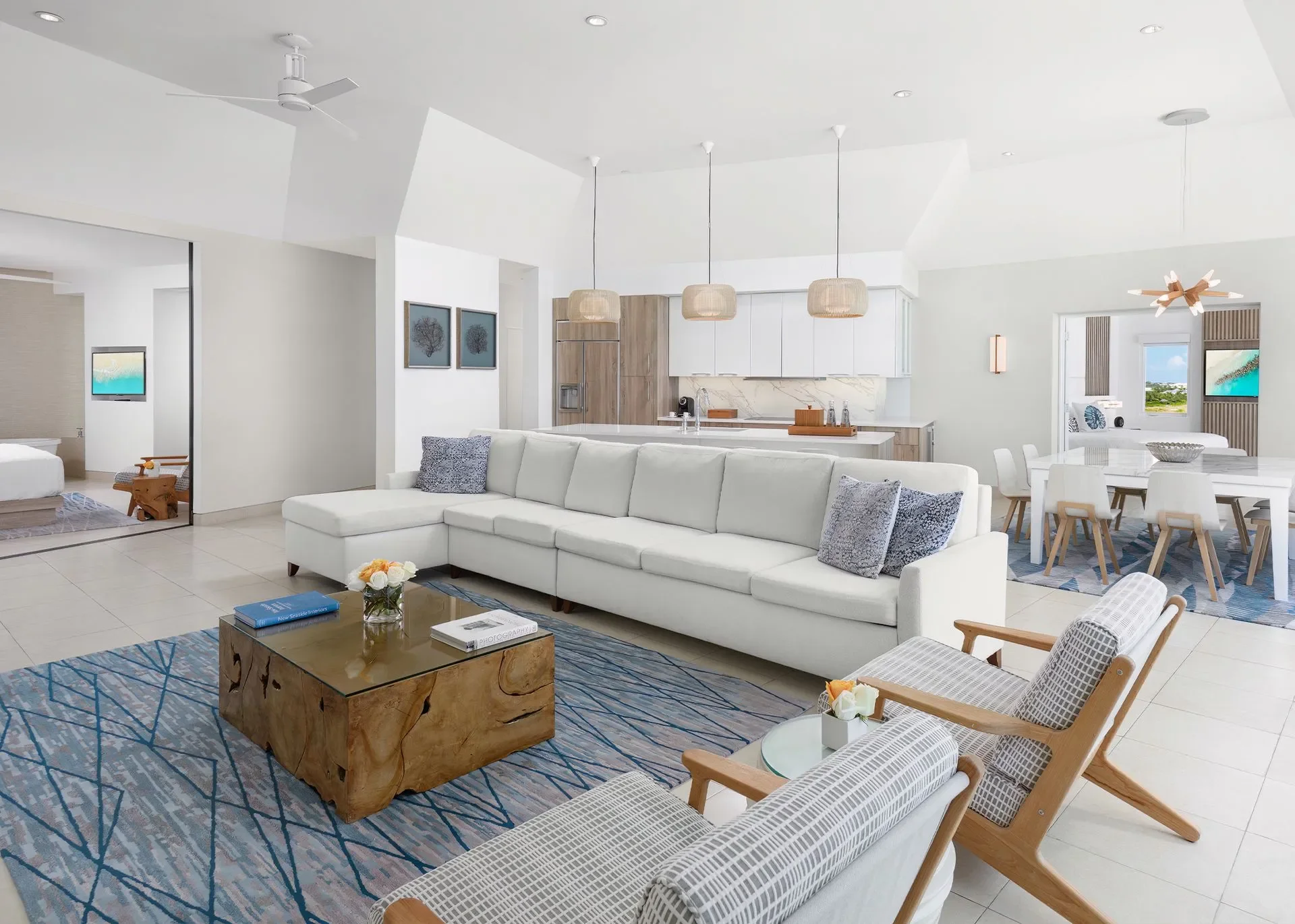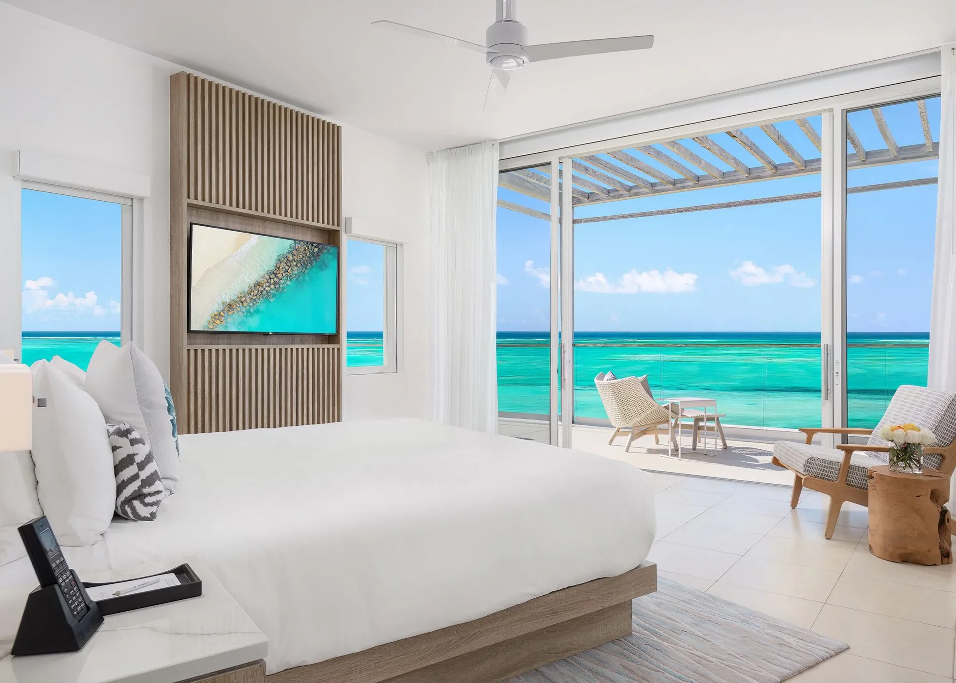 The resort’s 91 rooms and suites are an example of white-on-white elegance — crisp linens, sunlit walls, and private balconies that open to sweeping views of Grace Bay’s powder sands and the endless Caribbean blue beyond the reef.